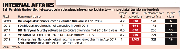 “Digital transformation is about how an enterprise changes everything they do,” he said, in a 2014 interview, “and how clients can change the organisational design process, procurement and distribution.” While Parekh’s first full quarter has been about bringing calm and stability to the offshore centres, he hasn’t taken his eye off developing Infosys’ sales prowess. Mohit Joshi, a president at Infosys, told analysts on Monday that the company is focussing on right client formation for large accounts. “We are investing in creating a team of deal directors. There are people who have worked on $50-million to $100-million deals. These are leading all our active pursuits,” he said.